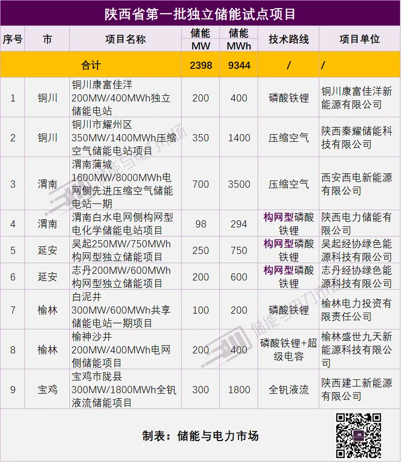 儲能與電力市場獲悉,12月30日,陜西發(fā)改委發(fā)布關(guān)于陜西省第一批獨立儲能試點項目遴選結(jié)果的公示,共9個項目,規(guī)模合計2.398GW/9.344GWh。技術(shù)類型包含磷酸鐵鋰(構(gòu)網(wǎng)型&跟網(wǎng)型)、壓縮空氣、全釩液流、磷酸鐵鋰+超級電容混合儲能。